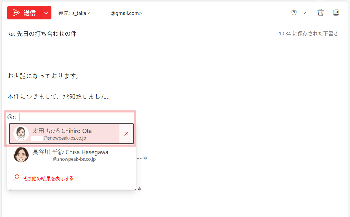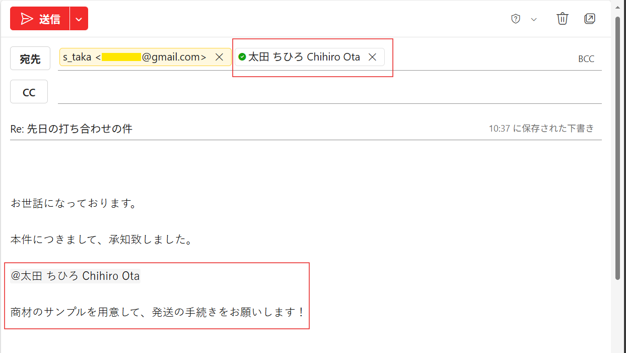 これにより、「本文で名前を呼んだのに、宛先に入れ忘れて届かなかった」というミスも防ぐことができます。