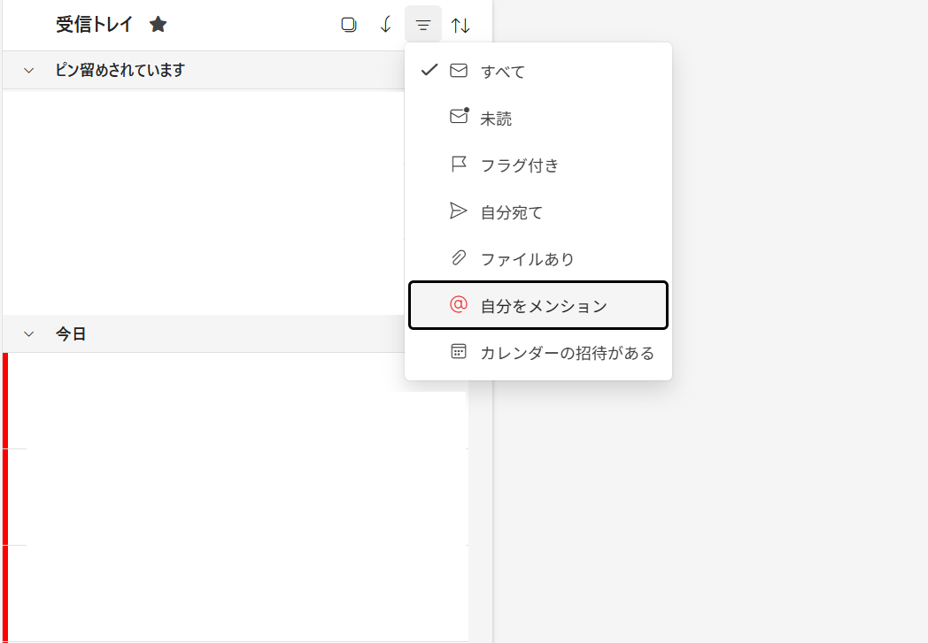 大量のメールの中から、自分がメンションされた(=優先度が高い)メールだけを確認したい場合は、受信トレイのフィルター機能を使います。