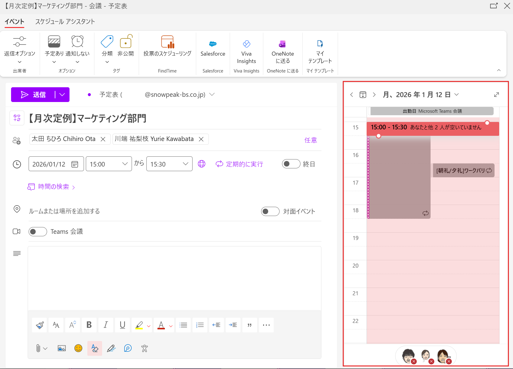 以下の画像のように「あなたと他2人が空いていません」といった警告が表示される場合、その時間は既に予定が埋まっています。ここで無理に送信してしまうと、後で「欠席」の連絡が来て再調整になることが予想されます。