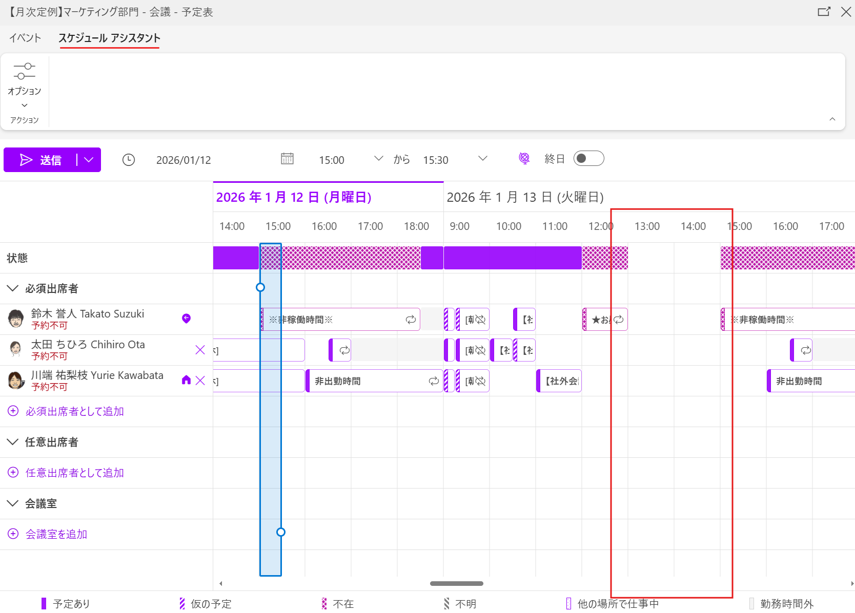 希望の日時(例:1月12日 15:00〜15:30)を入力した際、システムが自動的に参加者の予定をチェックします。
