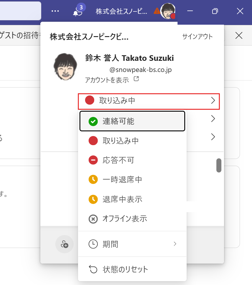 デフォルトでは「連絡可能(緑)」になっていますが、ここをクリックすることでステータスを変更できます。