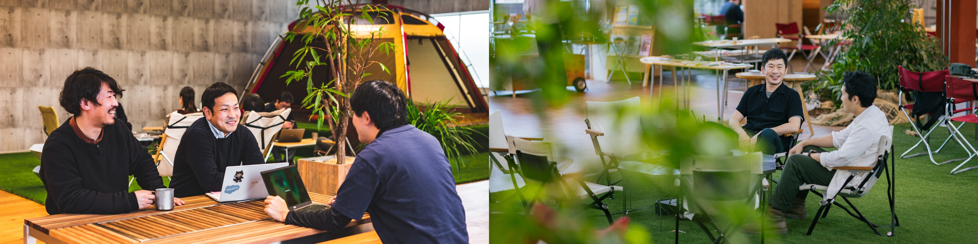 スノーピークが提案する「キャンピングオフィス」とは、キャンプ用品に自然音響や自然の香り、植栽などを組み合わせたオフィス空間のこと。自然を感じながら、人間らしく、ワクワク働ける環境は、柔軟な発想を生み、働く人たちのつながりや絆を深めてくれます。