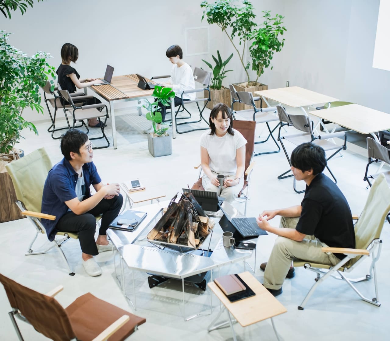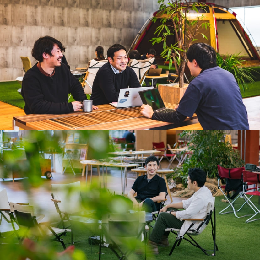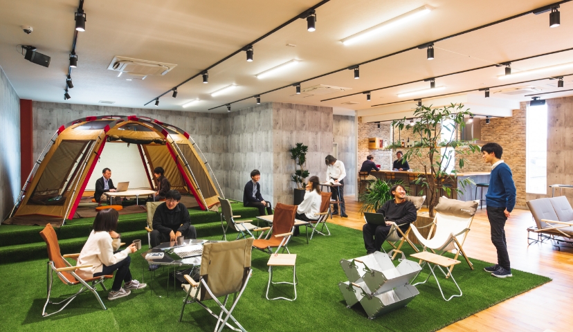 オフィスにテントや焚火台を導入するのは、意外に感じるかもしれません。実際に導入すると、自然と人が集まる人気のスペースに。輪になって座ることで、部門や年次の壁を取り払い、フラットで気軽なコミュニケーションが生まれます。