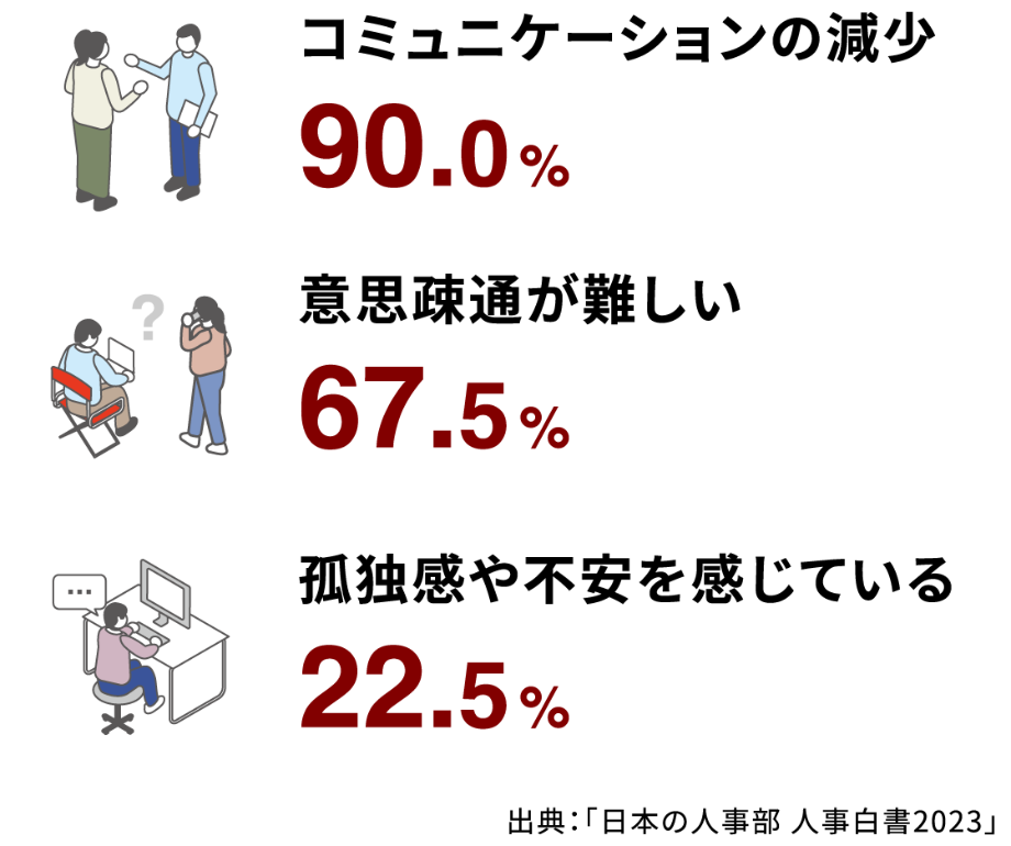 「日本の人事部 人事白書2023」によると、リモートワークの導入によって、組織開発に影響があるという結果が見られました。中でも、「従業員同士がコミュニケーションを取る機会が減少している」「従業員同士の意思疎通が難しい」という意見が多く上がっています。